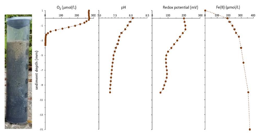 圖1、康斯坦斯湖沿岸沉積巖心中測試的氧,pH,氧化還原電位,和Fe(II)的剖面圖。從圖中可以看出,所取的海洋沉積物中的氧的濃度是隨著距離界面越遠(yuǎn),其氧的濃度最近降低,大約在界面下4mm處體系中的氧濃度幾乎為零。對于沉積物巖心中的pH值也是隨著沉積物界面處的深度增加表現(xiàn)為不斷變小。而對于氧化還原電位值表現(xiàn)為先減小后并最后穩(wěn)定120mv,但是體系中的二價鐵則表現(xiàn)為隨著距離沉積物界面處的距離增加,其二價鐵的濃度逐步增加。
