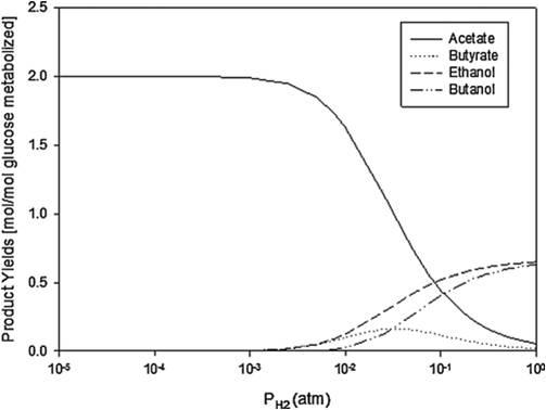 圖5、根據發酵途徑模型預測,產物產量是溶解H2的函數。pH=5.3(0.5 g/d灌注階段)。