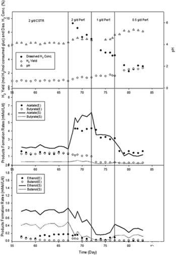 圖3、使用unisense微電極系統測試在不同操作條件下發酵罐中溶解H2濃度、H2產率及體系pH值(上);通過相關實驗和模型模擬了有機酸(中)的形成速率;和醇的生成速率。