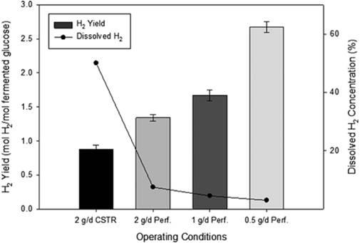 圖4、每種操作條件下的溶解H 2濃度和平均穩態H 2產率。誤差棒代表每日測得的H 2產量的標準偏差。