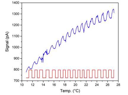 圖4、溫度從11°C穩(wěn)定升高到27°C時,微電極信號(藍(lán)色,運(yùn)行平均值為5 s,運(yùn)行平均值為450 nM一氧化二氮),同時以與原位相同的頻率切換(紅色)。該微電極已使用了4個月,與新制造的微電極相比,零信號已增加了約40倍。從圖4所示的溫度校準(zhǔn)數(shù)據(jù)可以看出,用了四個月的微電極的零信號在室溫下以相對較高的噪聲水平增加了40倍,達(dá)到1000 pA以上。