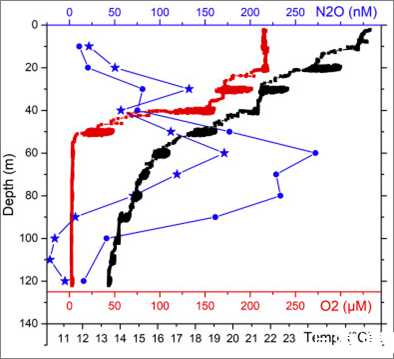 圖5、墨西哥西部ETNP區(qū)域上部120 m(1740.99 N,10221.02W,底部深度1040 m)的N2O深度剖面于2018年4月15日通過可切換的N2O微電極(藍(lán)星)現(xiàn)場測量),然后通過氣相色譜法對回收的水樣進(jìn)行處理(藍(lán)色圓圈)。另外,繪制了溫度(黑色)和O 2(紅色,平均1s)的數(shù)據(jù)。
