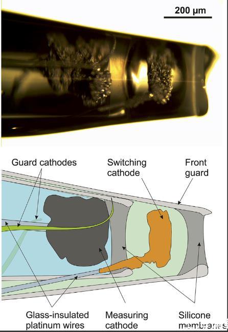 圖1、可切換N2O微電極的照片及相應(yīng)的原理圖。可切換的一氧化二氮微電極(圖1)的構(gòu)造步驟與STOX微電極相同。將前保護(hù)陰極鍍在涂覆有特氟隆的0.025mm鉑-銥線的裸露金屬尖端上。鉑-銥的使用提供了更高的機(jī)械強(qiáng)度,與最初描述的STOX微電極相比,聚四氟乙烯涂層的柔韌性大大提高了抗機(jī)械沖擊性