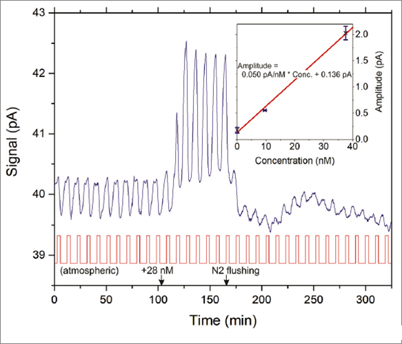圖2、微電極信號跟蹤(藍(lán)線),在工作前180秒和400秒間隔(運(yùn)行信號平均超過10秒)(運(yùn)行信號平均10 s以上)。紅線顯示前護(hù)板打開(高)和關(guān)閉(低)的時間段。最初,將微電極浸入含有約9.6 nM一氧化二氮的氣泡水中。在100分鐘時,通過注入少量濃縮水將N2O濃度增加28 nM(總計37.6 nM)。在約170分鐘時,用N2鼓氣(0 nM N2O)。插圖顯示了極化開/關(guān)循環(huán)期間信號幅度相對于濃度的相應(yīng)校準(zhǔn)曲線,平均值為4個循環(huán)的平均值,并標(biāo)出了標(biāo)準(zhǔn)偏差。