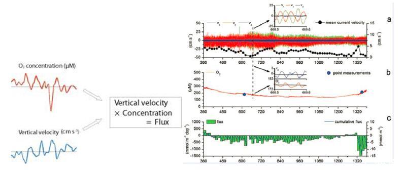 Unisense采用渦動(dòng)相關(guān)法開發(fā)了一款測(cè)量水土界面氧氣交換通量、硫化氫交換通量、溫度和電阻率交換通量的儀器----水底渦動(dòng)相關(guān)系統(tǒng)。該技術(shù)不會(huì)擾動(dòng)沉積物、完全考慮了波浪對(duì)沉積物的影響,可以連續(xù)監(jiān)測(cè)沉積物水動(dòng)力邊界層、海草床、珊瑚礁等地點(diǎn)的垂直氧氣通量,是沉積物孔隙水剖面法和水底原位箱法的補(bǔ)充。將來會(huì)成為測(cè)量界面氧通量的標(biāo)準(zhǔn)方法。